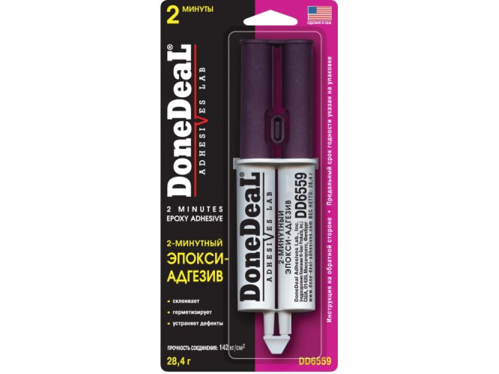 2-х минутный эпокси-адгезив DD6559 (28,4г) — предназначен для склеивания в любых сочетаниях стали, чугуна, сплавов алюминия, цветных металлов, керамики, фарфора, стекла, дерева, картона и большинства пластмасс. После полимеризации безвреден, устойчив к воздействию нефтепродуктов, воды, растворителей. Обладает хорошими эксплуатационными характеристиками, не дает усадки, выдерживает постоянные и переменные нагрузки в интервале от -550С до +1150С. Время схватывания — 1,5 -2 минуты, время полимеризации — 10 минут, время полной полимеризации — 4 часа, прочность соединения — 142кг/см2. DD6559 после полимеризации безвреден, устойчив к воздействию нефтепродуктов, воды, растворителей;обладает хорошими эксплуатационными характеристиками, не дает усадки, выдерживает постоянные и переменные нагрузки, вибрации; упаковка "сдвоенный шприц" позволяет добиться точной дозировки компонентов и стабильной прочности клеевого шва.