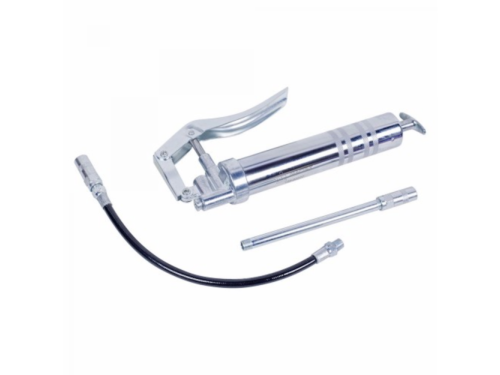 Шприц рычажно-плунжерный МАСТАК предназначен для порционной смазки узлов агрегатов таких как крестовины и карданы, а так же шаровых опор. Конструкция предусматривает прямое и угловое крепление насадки. Предусмотрено использование картриджей 120 мл (3 oz). В комплект входит гибкий армированный нейлоновый шланг 305 мм. Технические характеристики: - Рабочее давление 200 атм. - Максимальное давление 275 атм