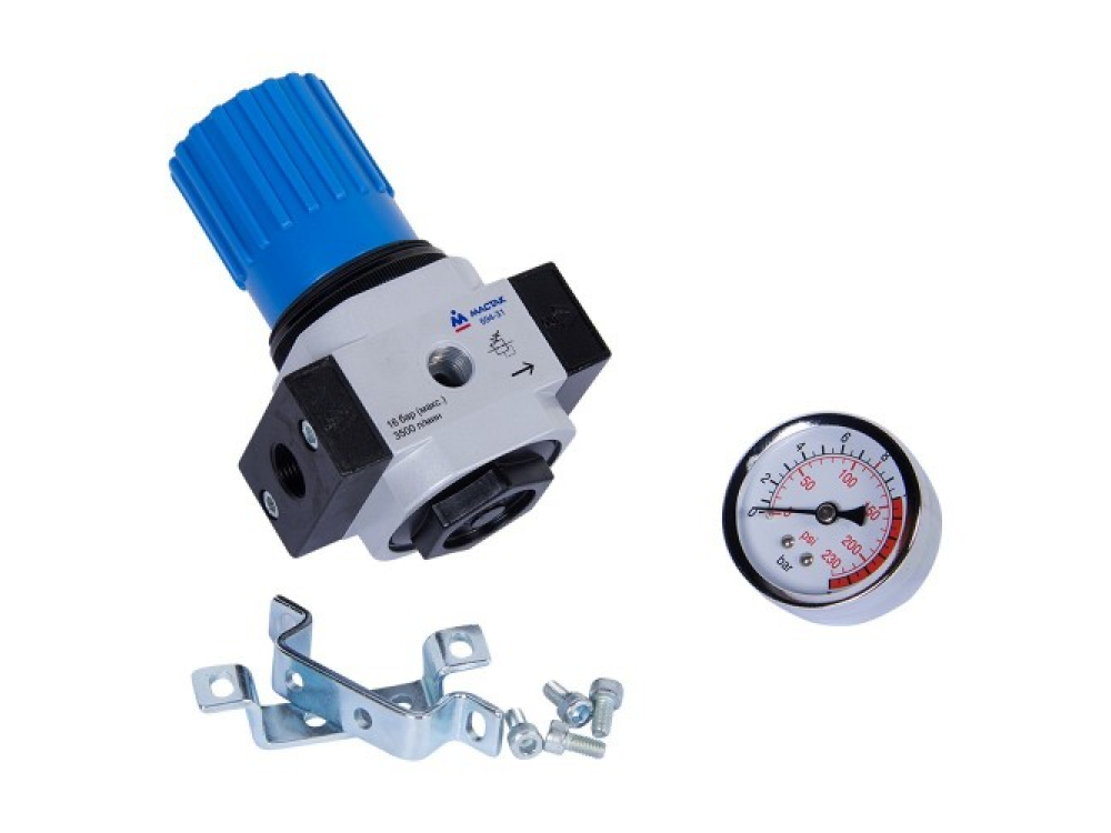 Манометр регулятор 3/8", МАСТАК 694-31 для регулировки давления сжатого воздуха в пневматической линии. Область применения: Автосервис, СТО. Конструкция устройства - Редуктор: выставление номинального давления на выходе, необходимого для нормальной работы инструментов и оборудования. Механизм редуктора встроен в блок фильтра. - Манометр: контроль давления, устанавливаемого редуктором. Манометр установлен на корпусе блока фильтра. Меры предосторожности - Соблюдайте правильность подключения в воздушную магистраль. - Не подключайте устройство к магистрали, давление в которой превышает максимально допустимое. Технические характеристики - Рабочее давление, бар 1,5 - 12 - Максимальное давление - бар 16 - Пропускная способность - 3500 л/мин - Рабочий диапазон температур от -10 до 60°С - Соединение, резьба вход/выход 3/8” внутр. / 3/8” внутр. - Габариты - 220х90х60 мм - Вес - 1,2 кг