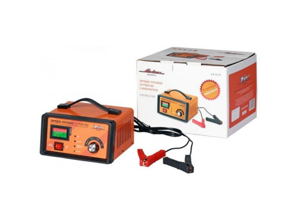Зарядно-пусковое устройство имеет ручной режим зарядки с селектором максимального зарядного тока 2/10 Ампер и максимальным пусковым током 55А.