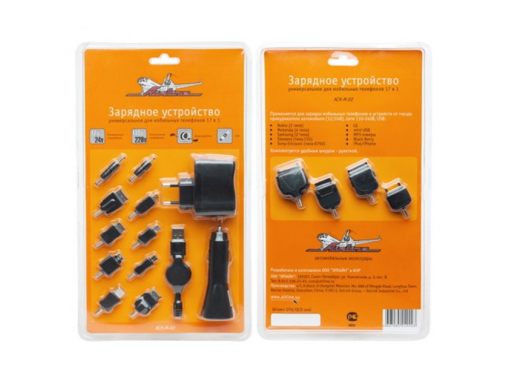 AIRLINE представляет расширенный комплект серии зарядных устройств для мобильных телефонов. В наборе предложены 17 адаптеров для телефонов различной марки и года производства. Подключение осуществляется с помощью машинного прикуривателя либо стандартной розетки питания в 220Вт. Выходной ток 500 мА. Применяется для зарядки мобильных телефонов и устройств Nokia (2 типа), Motorola (4 типа), Samsung (2 типа), Siemens (типа C55), Sony-Ericsson (типа K750), LG, mini USB, MP3 плееры, Black Berry, iPod/iPhone от гнезда прикуривателя автомобиля (12/24В), сети 110-240В, USB. Комплектуется удобным шнуром – рулеткой.